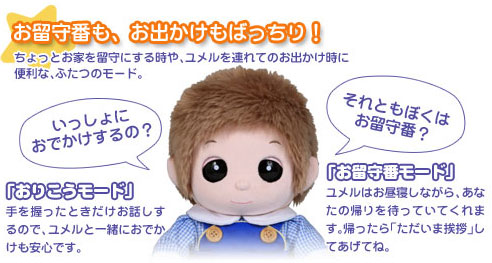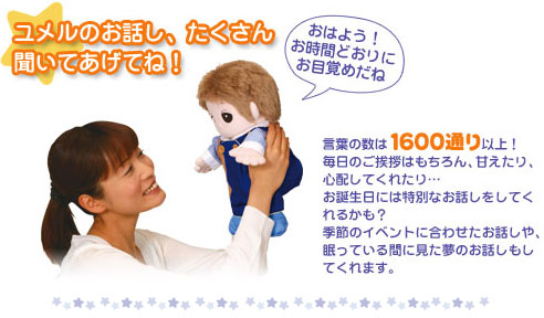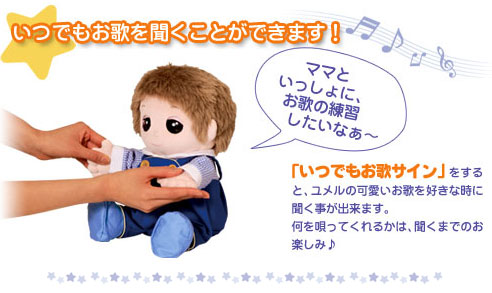 頭や背中をなでなでしたり、手を握ってあげると、その日の気分で話かけてきたり童謡やオリジナルソングまで歌ったり、感情豊かに愛くるしく応えてくれます。さらにお世話をしてあげると、あいさつをはじめ、お誕生日のお祝いまでできるようになって、素敵なパートナーとしてあたなを癒してくれます♪